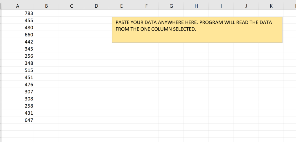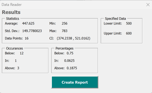 This template will read a given column of number data pasted into sheet and return powerful insights into your data very quickly then create a report for you. Starts by pasting number data, clicking a button to specify lower /min and upper/max limit or threshold. Then you will get a report with statistics about your data.
